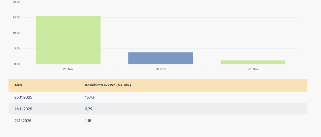 Sähkön hinta nyt on tänään poikkeuksellisen matala, sillä keskiviikon keskihinta putosi vain 3,79 senttiin kilowattitunnilta. Romahdus on huomattava, sillä vielä tiistaina sähkö maksoi 15,43 snt/kWh, ja torstaille ilmoitettu taso on vielä tätäkin halvempi – vain 1,18 senttiä. Näin suurta laskua ei ole nähty marraskuussa pitkään aikaan.